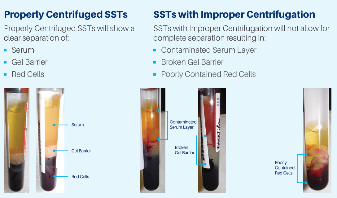 Let all serum separator tubes (ST) clot upright in a tube rack, for at least 30 minutes. Let plain red top (RT) tubes clot upright for at least 60 minutes. This prevents the blood clot from sticking to the top of the tube while clotting. ST and RT tubes should be centrifuged within 2 hours of collection to preserve analyte stability. The gel barrier in a ST tube must be well formed to ensure red cells do not come in contact with the serum, as prolonged contact between the serum and red cells can falsely increase potassium and decrease glucose. If there are red cells in the serum, the serum should be pipetted into a transfer tube, centrifuged again and separated into another transport tube.