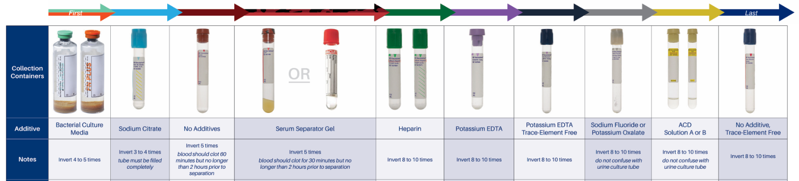 Specimens should be collected in order per the chart below to prevent potential contamination from one tube to the next.